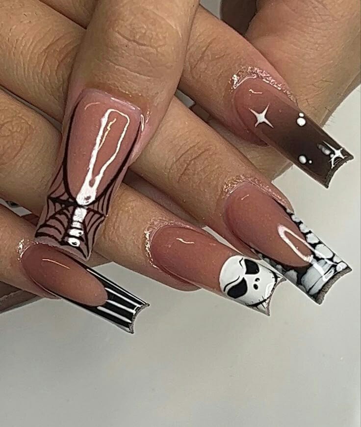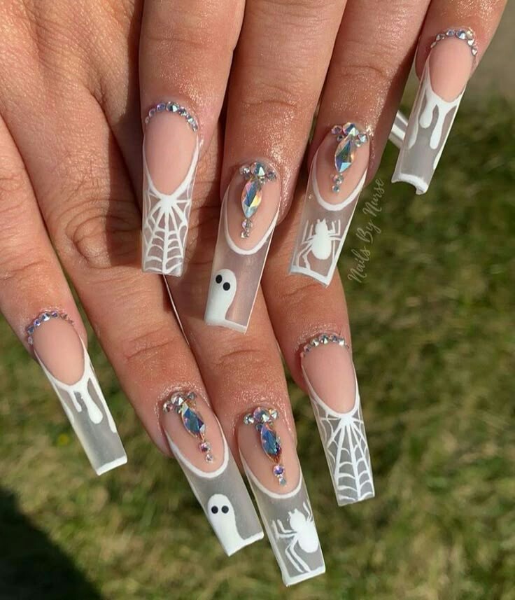 A soft nude base with white webs, drips, tiny ghosts, spider and sparkling gems that mix spooky with elegance.