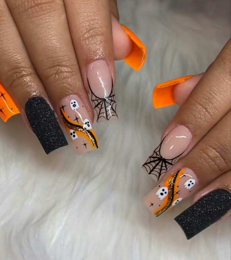Orange and black nails with glitter, spiderwebs, and cute ghost details for a playful Halloween look.