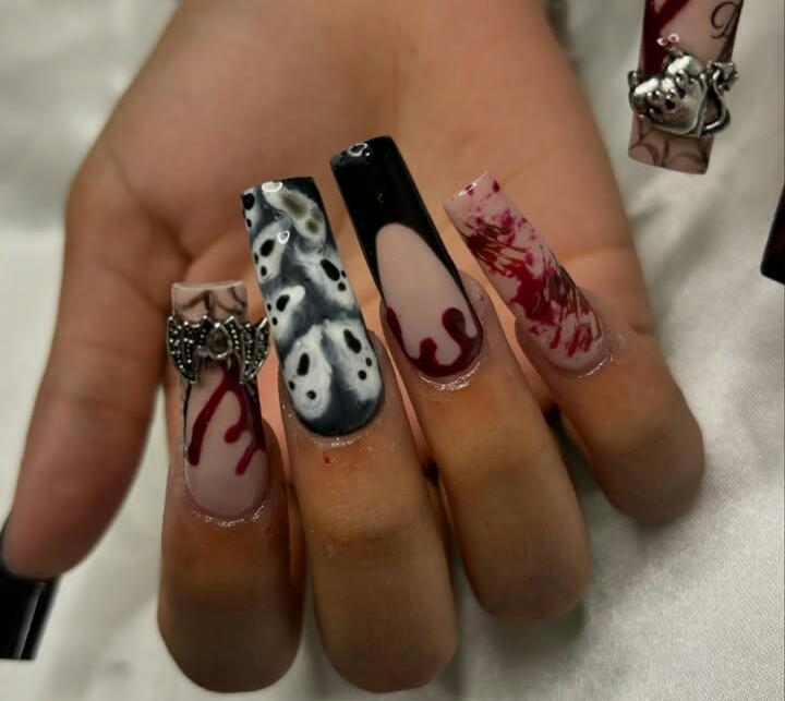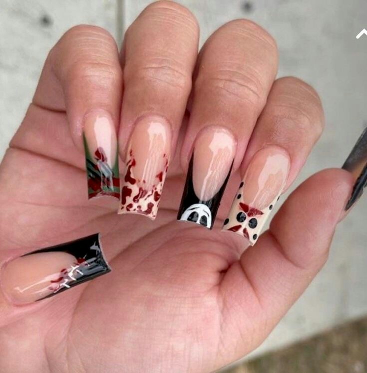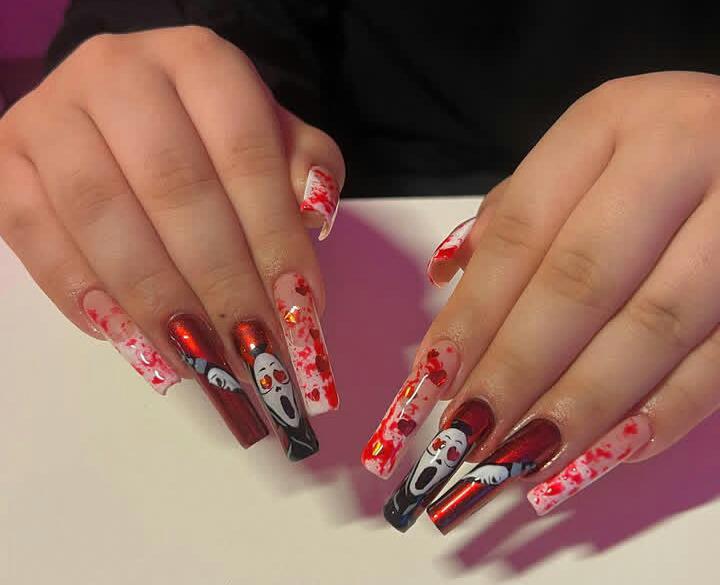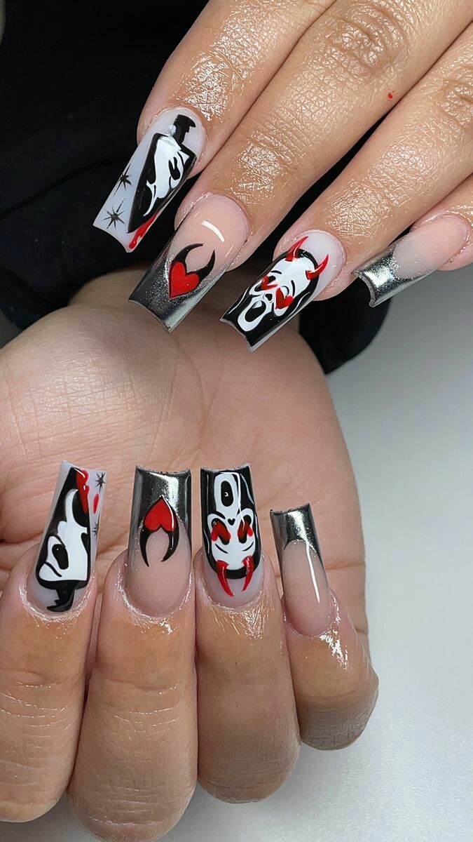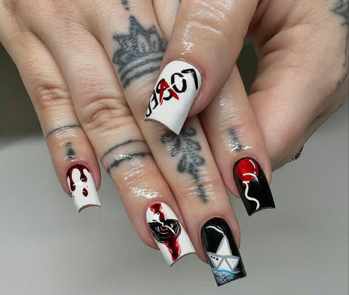 Black, white, and red nails with creepy details like blood splatters, balloons, and horror-inspired graphics for a chilling vibe.
