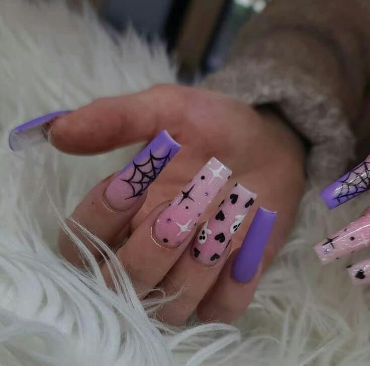 Light purple and pink nails with spiderwebs, stars, and tiny ghosts, creating a fun and slightly cute spooky style.