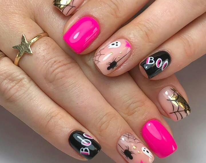 A fun mix of hot pink nails with spooky accents like ghosts, webs, spiders, and “Boo” lettering for a cute yet creepy vibe.