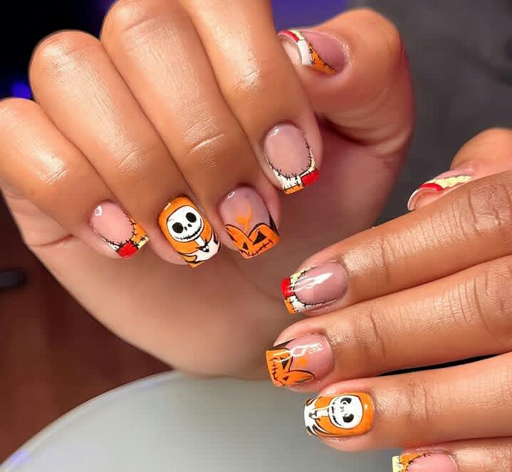Sharp orange French tips paired with black stitched patterns and a tiny pumpkin detail, blending spooky with festive Halloween charm.