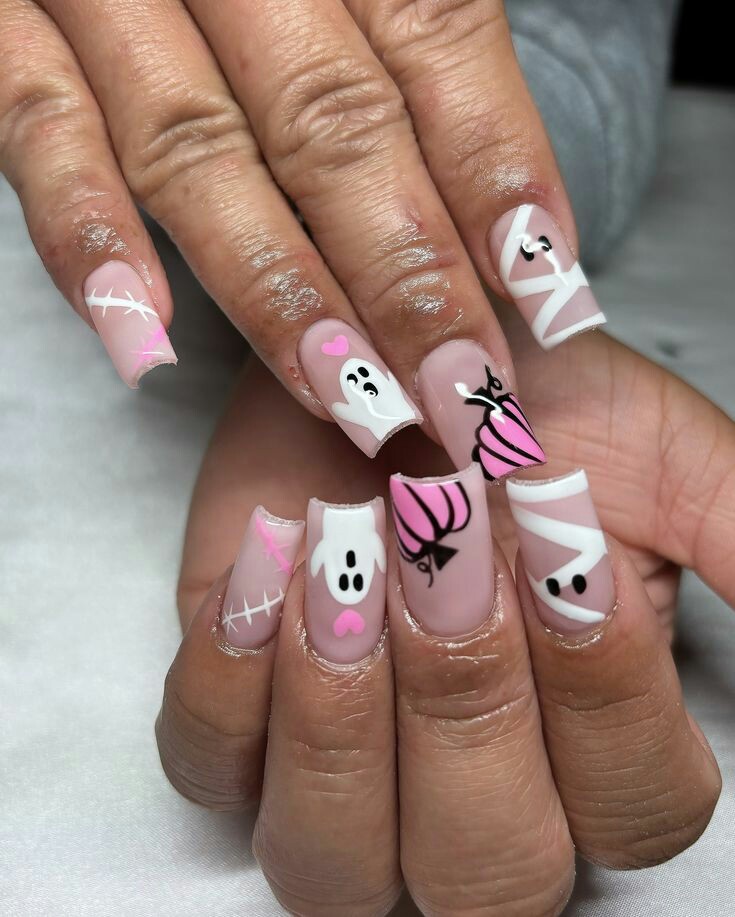 A playful combo of Halloween staples like ghosts, pumpkins, blood drips, and eerie colors for a bold, festive look.