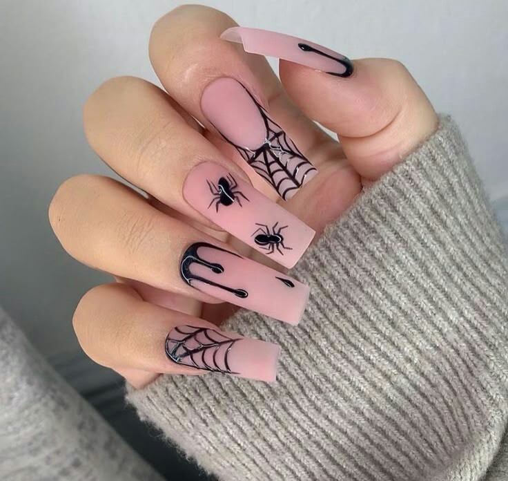 Matte nude nails detailed with spider webs, dripping black designs, and creepy little spiders for a sleek, spooky effect.