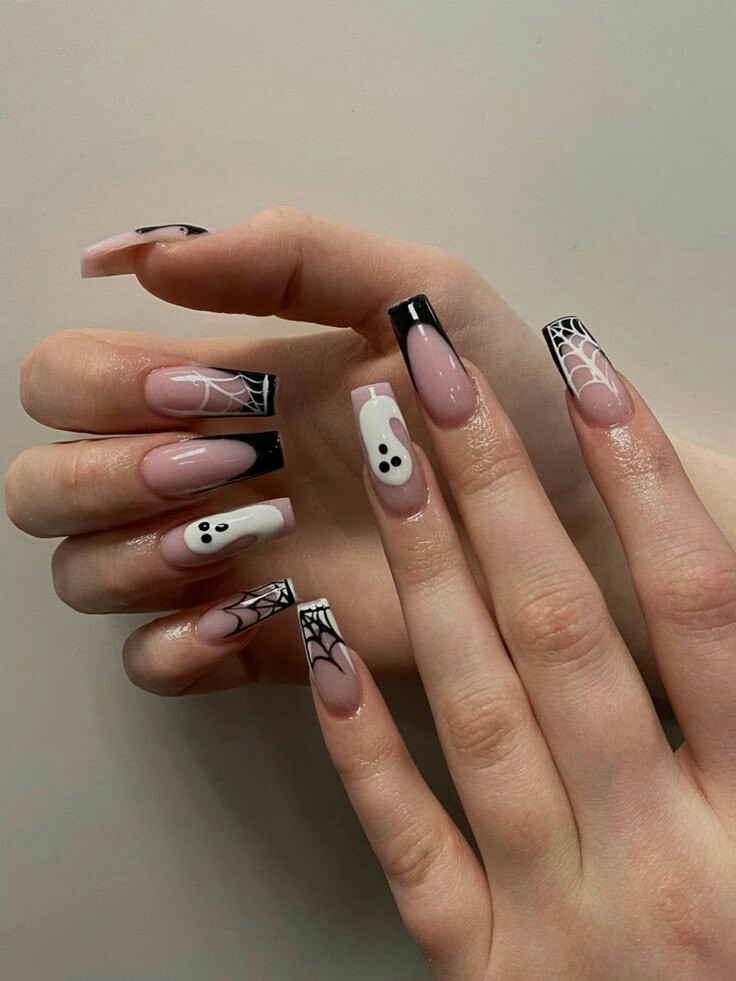 A chic mix of glossy black French tips with white spiderwebs and playful ghost accents, giving a spooky yet stylish vibe.