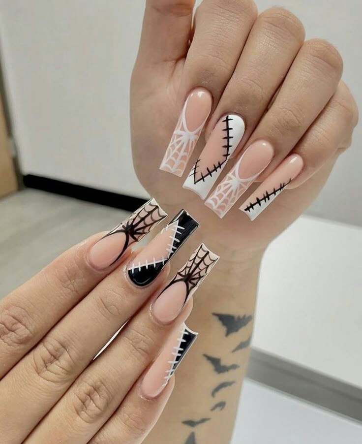 Nude nails dressed with bold black-and-white webbing and stitched details, creating a Frankenstein-inspired Halloween look.