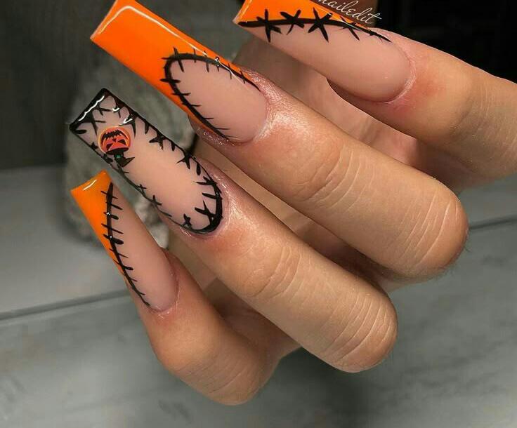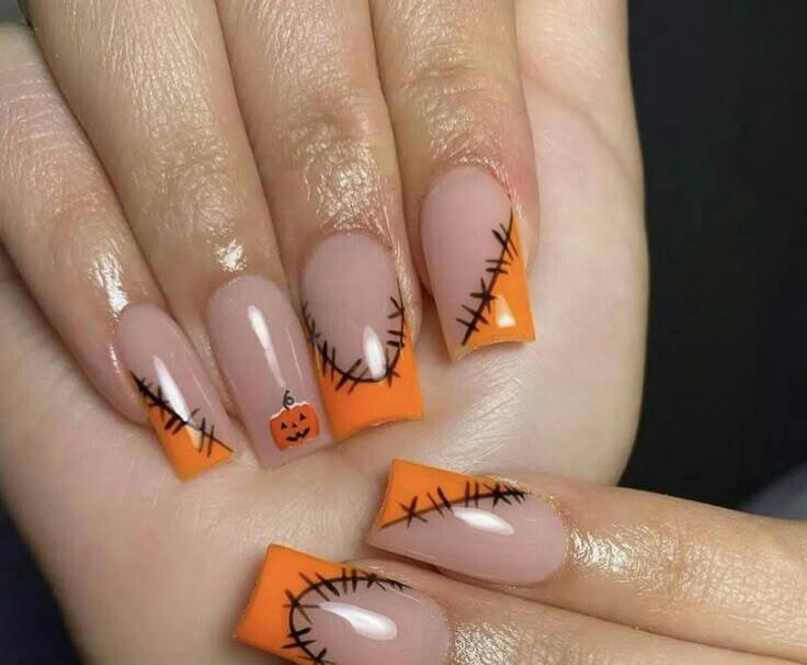 A nude base with bold orange square tips outlined by black stitch designs, giving a spooky stitched-up vibe with a tiny pumpkin accent.
