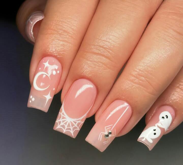 A softer, playful look with pale pink nails, white ghost, spiderweb, and moon accents, adding a fun yet eerie touch.