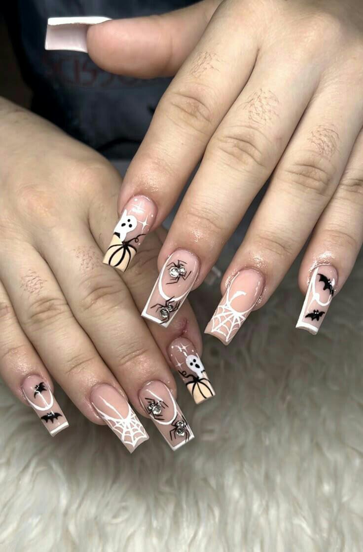 A playful nude base with white spider webs, bats, ghosts, and tiny spiders for a cute yet spooky vibe.