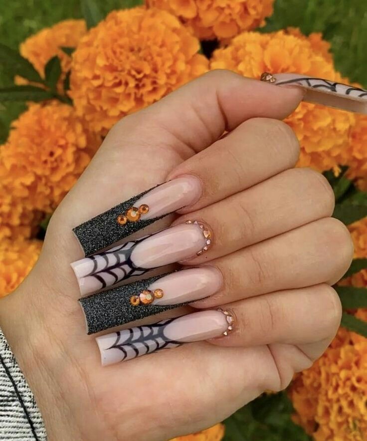 Long nude nails with black glitter tips, spider web accents, and orange rhinestones for a sparkly Halloween glam look.