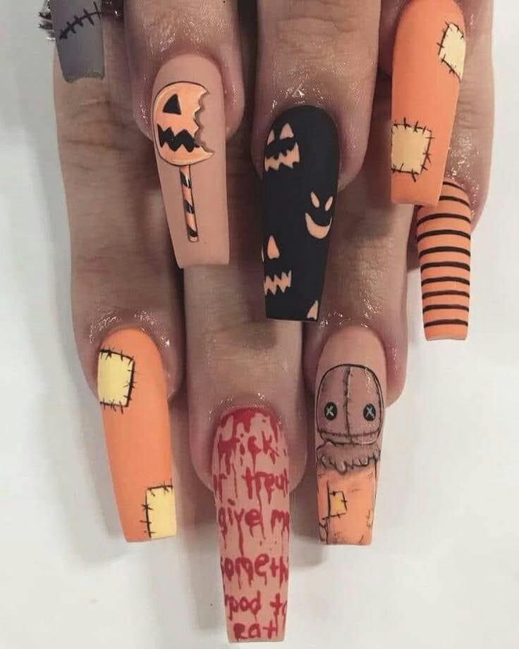 Matte orange and black nails featuring jack-o’-lanterns, stitches, stripes, and creepy lettering for a bold horror-inspired style.