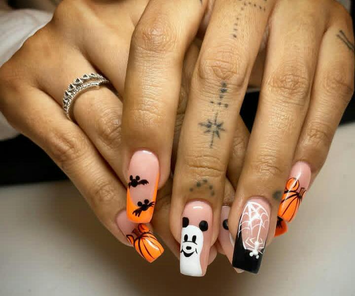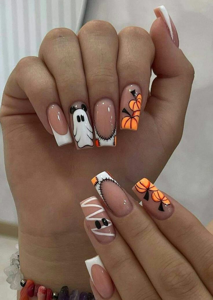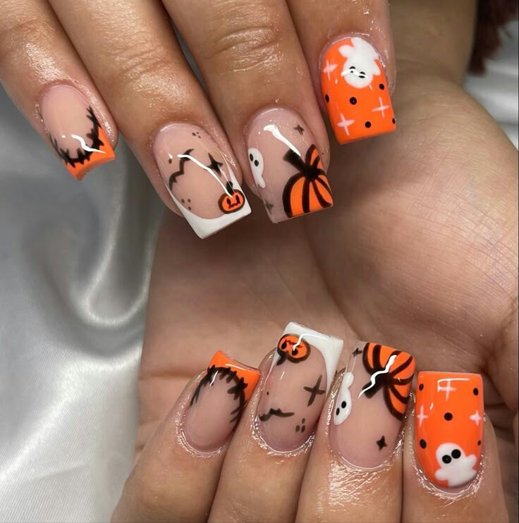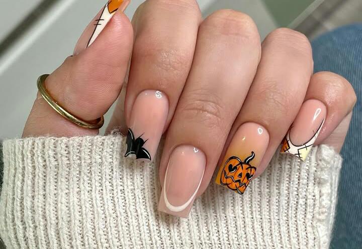 A bright and fun mix of orange pumpkins, bats, and ghosts on a nude base, giving a cheerful Halloween look.