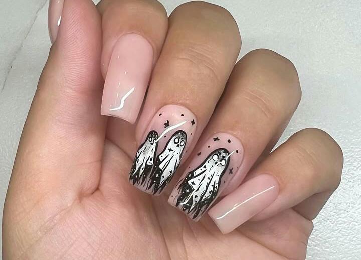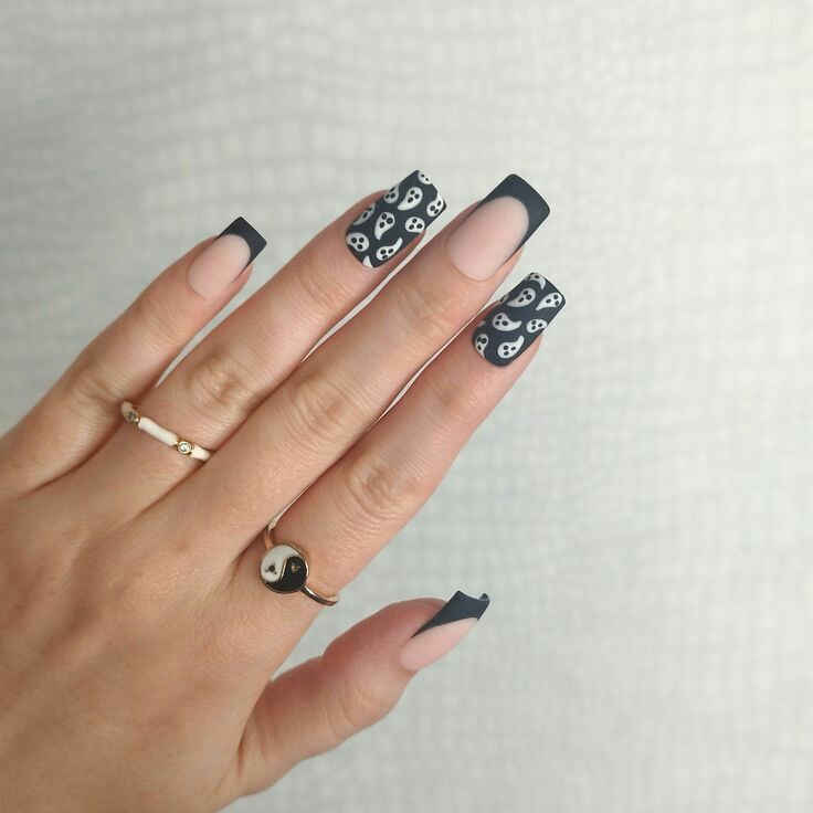 Matte black French tips paired with playful white ghost patterns on a nude base, keeping it sleek yet festive.