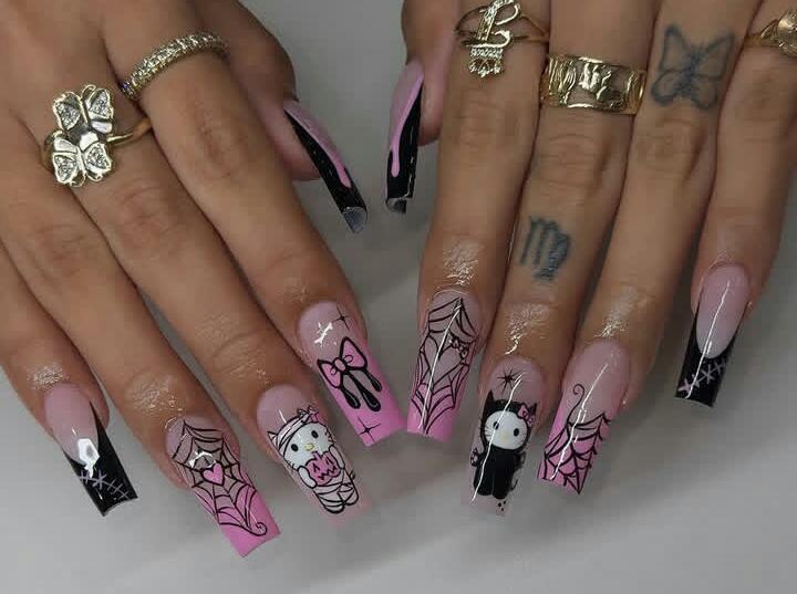 A fun twist on the spooky season with pink spider webs, ribbons, hello kitty and black tips for contrast.