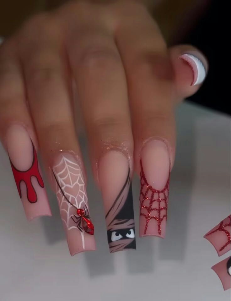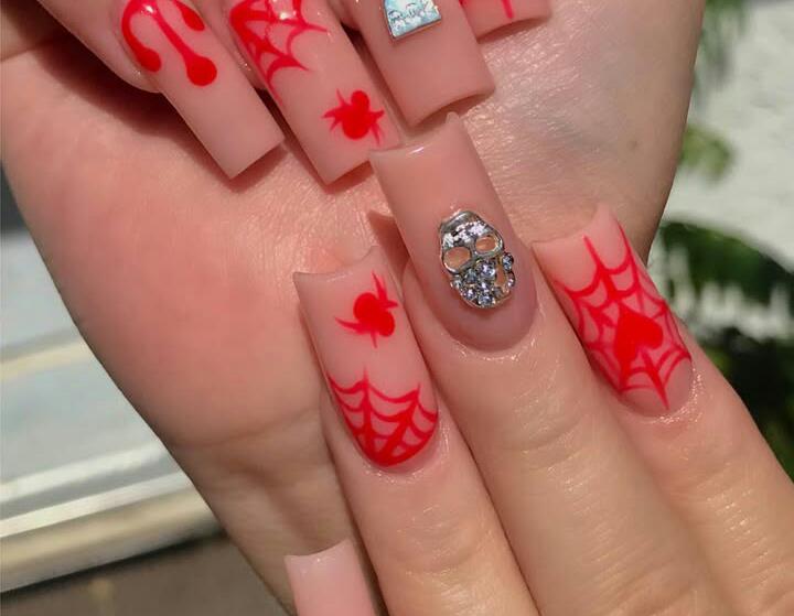 Red spider webs and spiders on a nude base, finished with a jeweled skull accent for extra Halloween glam.