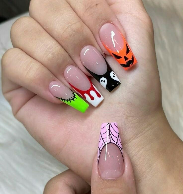 A bold mix of neon green, dripping red, ghostly black-and-white, and fiery orange pumpkin faces, giving each nail a unique Halloween vibe.