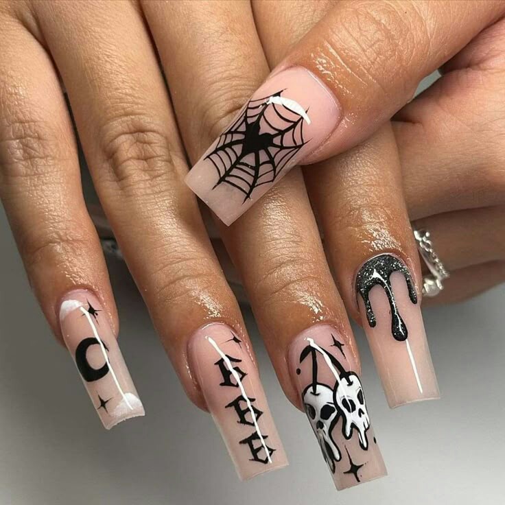 A sleek black-and-nude design with spider webs, dripping black polish, eerie skulls, and gothic lettering for a dark and edgy Halloween look.