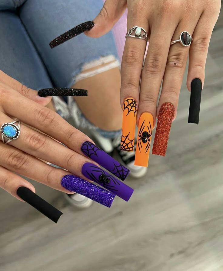 Vibrant orange, purple, and glitter nails paired with black spiders and web accents, blending glam with spooky Halloween energy.