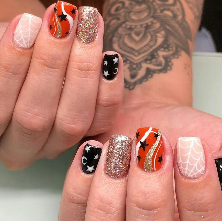 A playful short-nail look with orange, black, gold glitter, stars, moons, and white spider webs for a festive yet chic style.
