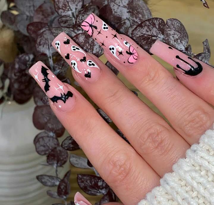 A dreamy pink base decorated with bats, ghosts, stars, and dripping black polish for a chic yet eerie style.