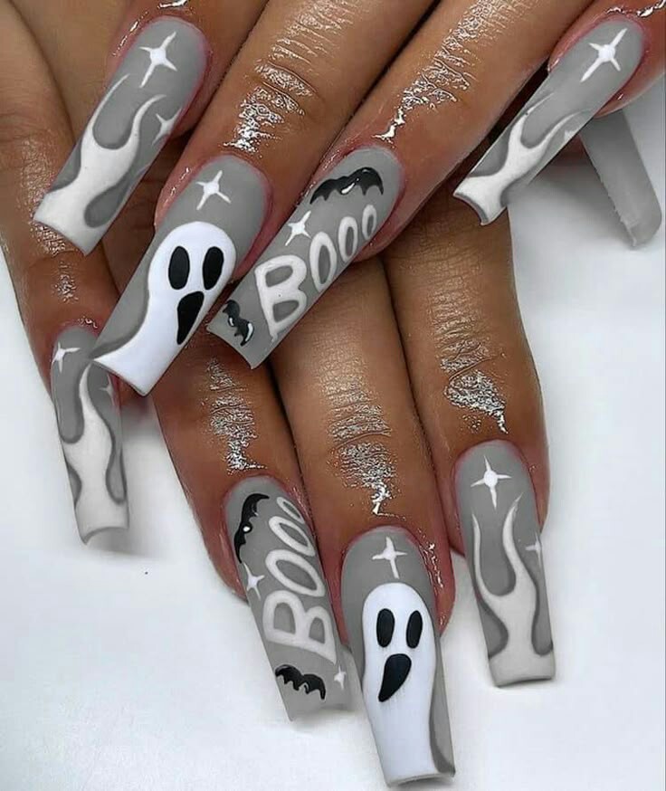 A spooky-chic set with gray and white tones featuring flames, ghosts, bats, and “Boo” details for a bold Halloween vibe.