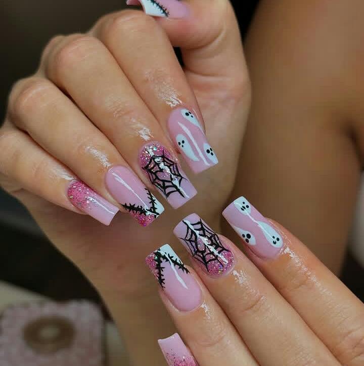 Soft pink nails dressed with sparkly glitter, spider webs, and tiny floating ghosts for a cute yet creepy twist.