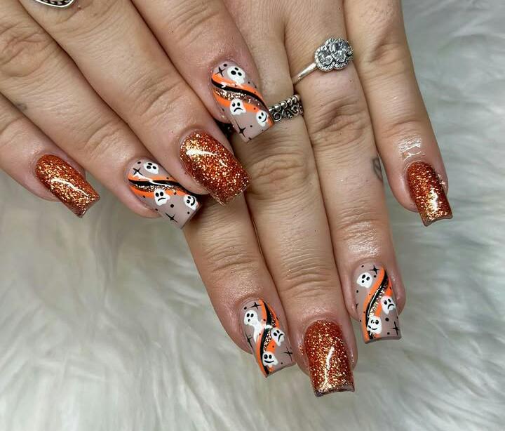 A warm glittery orange design with swirling ghost accents and Halloween details, blending festive glam with spooky charm.