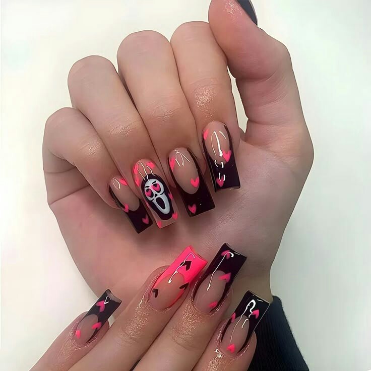 Dark square nails with pops of neon pink hearts and drips, featuring a bold Scream mask design for a fun yet creepy effect.