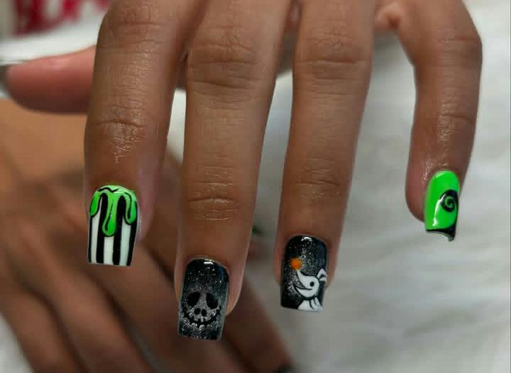A mix of eerie black glitter nails with skull and ghost art, paired with neon green accents and drips for a glowing haunted look.