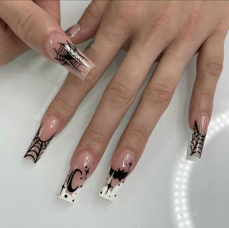 Clean nude and white square nails decorated with spider webs, bats, and drips, balancing spooky Halloween charm with a sleek finish.