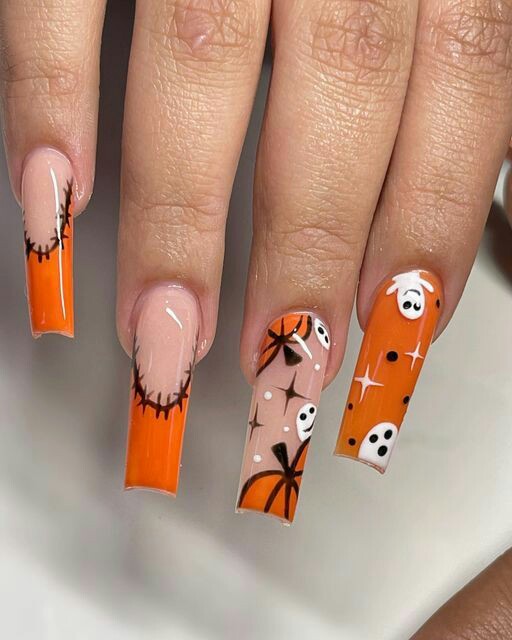 Bright orange nails filled with Halloween spirit, featuring stitched tips, tiny pumpkins, and cute ghost designs for a playful spooky vibe.