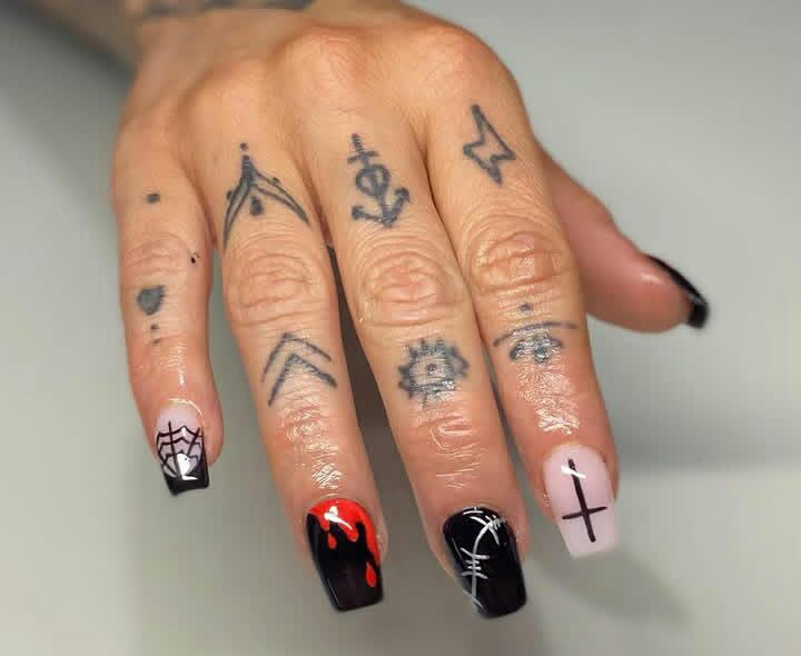 Short black and nude nails decorated with crosses, webs, blood drips, and stitched details for a gothic, spooky effect.