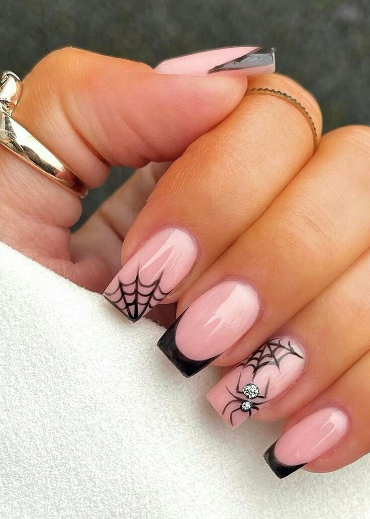 Soft nude nails with black French tips and spider web art, accented with rhinestones spider for a classy yet creepy touch.