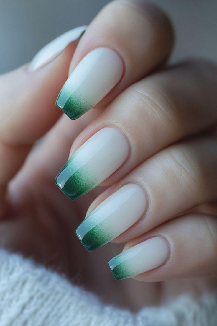 This design features a soft white base with gentle green ombré tips for a clean, modern French look. The overall vibe is fresh and subtle, with just enough green to feel St. Patrick’s Day is festive without being loud.