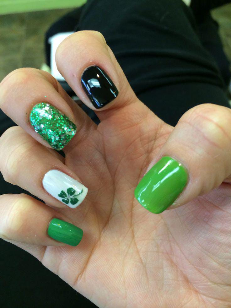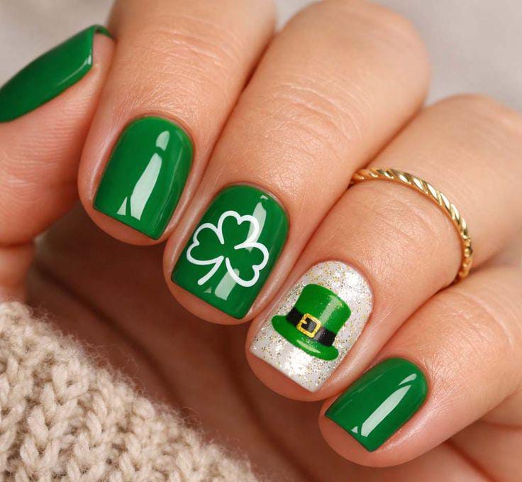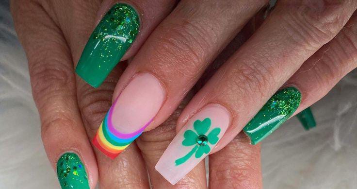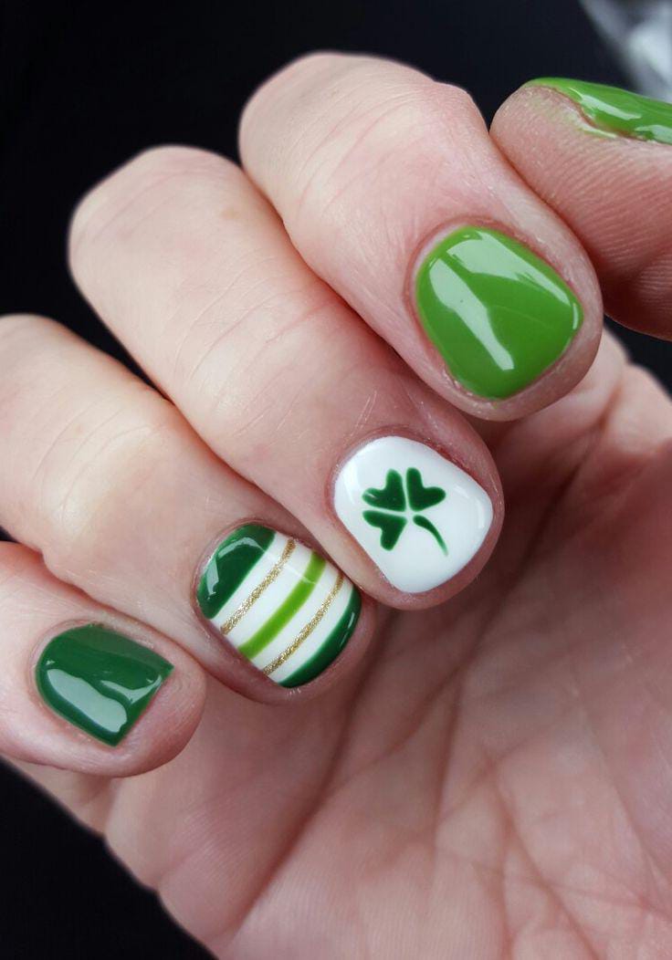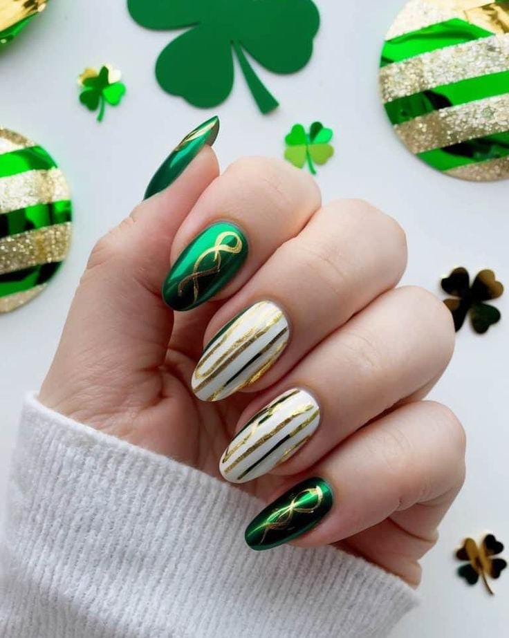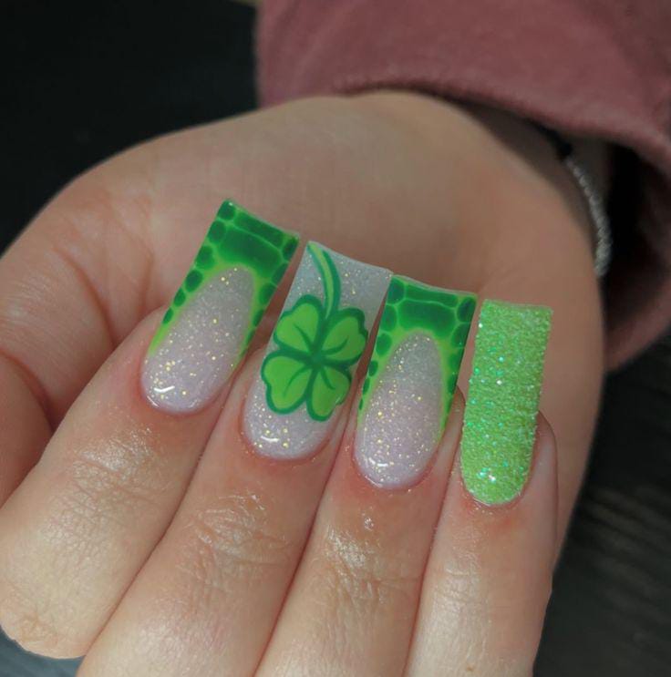 A simple mix of green, black, white, and glitter nails creates a clean, coordinated St. Patrick’s Day palette. The small clover detail adds charm without overpowering the subtle vibe.