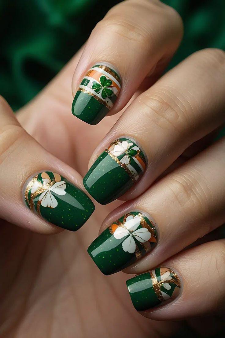 Rich green nails are paired with dainty white clover accents and thin gold, orange striping. The overall look is polished and stylish, giving a subtle St. Patrick’s Day festive nod with a more refined, decorative feel.