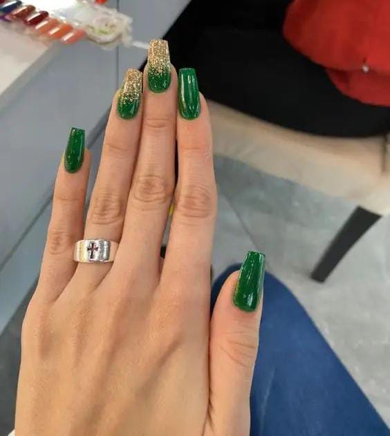 A simple glossy green manicure with gold-glitter Fade accent nail adds a hint of sparkle. The vibe is clean and subtle, perfect for a low-key St. Patrick’s Day look that still feels special.