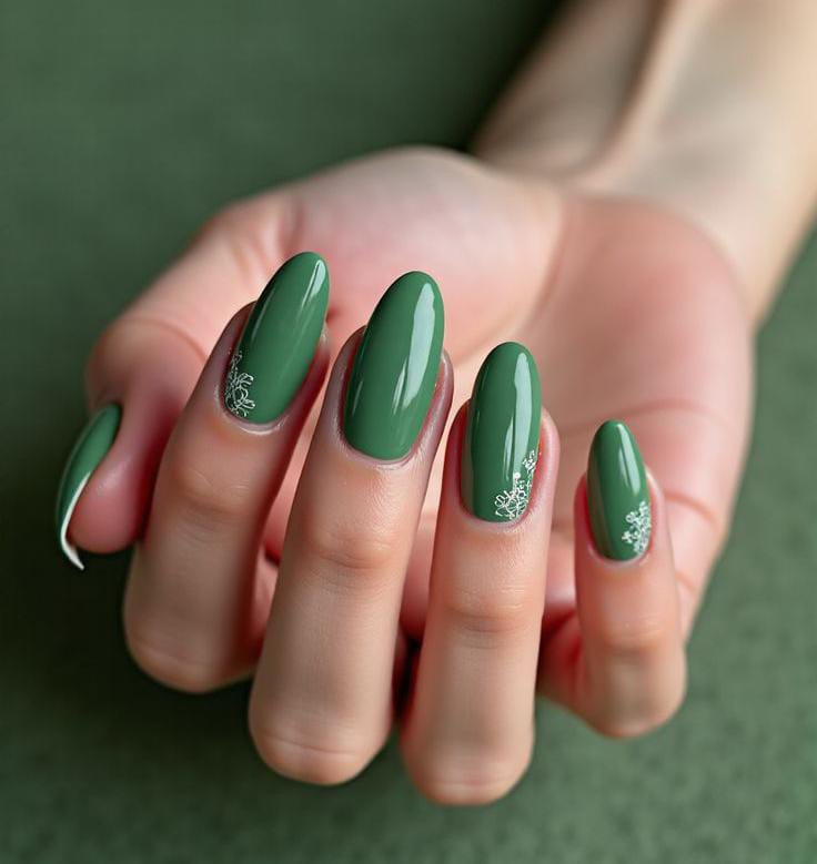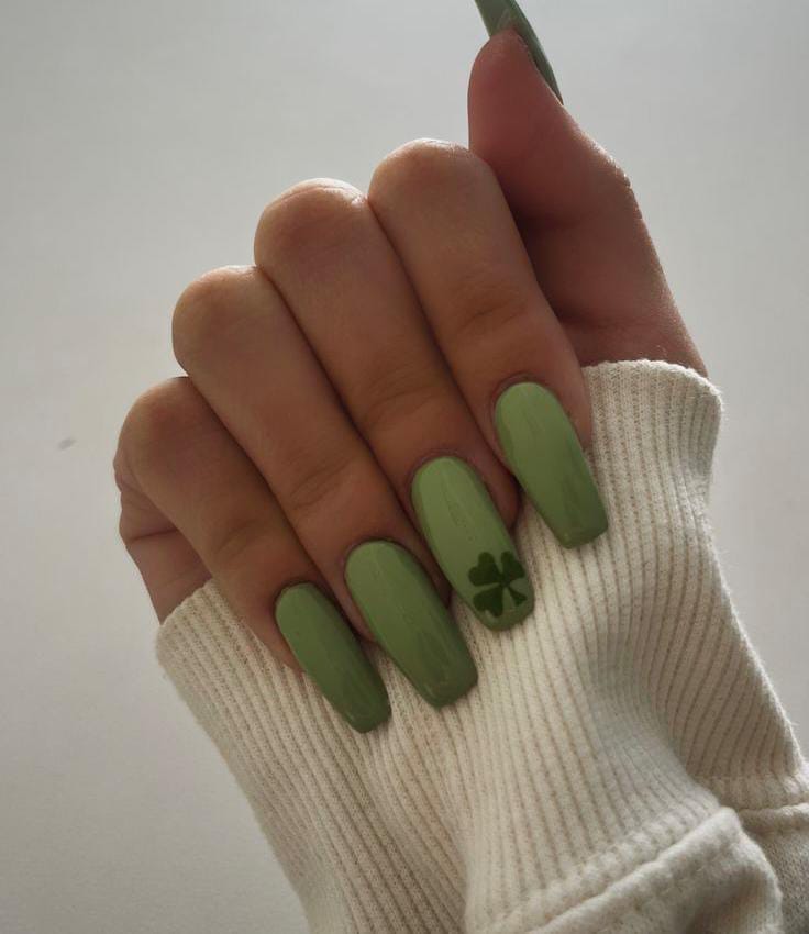 Muted green nails with tiny white leaf accents create a calm and elegant look. The style is subtle and modern, perfect if you want something St. Patrick’s Day is festive but refined.