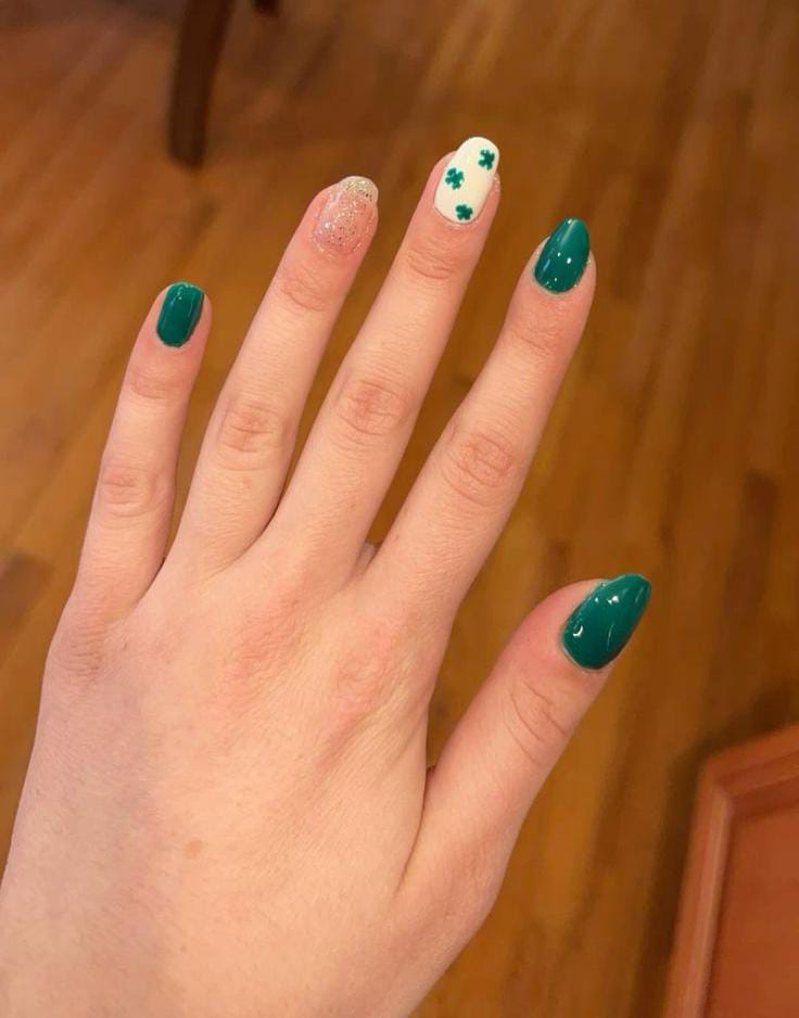 Deep green nails are paired with a soft neutral shimmer accent and a simple clover detail on white base. The mix of glossy green and light tones keeps the design subtle St. Patrick’s Day is festive but not over-the-top.