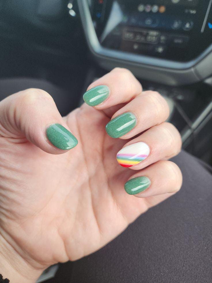 Soft, shimmery green nails create a polished everyday look with one playful rainbow accent nude nail. The vibe is subtle and cheerful, adding a quiet pop of St. Patrick’s Day color.