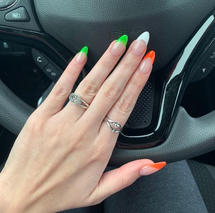 Natural nude nails are finished with bright green, white and orange French tips for a clean, subtle St. Patrick’s Day twist. The color placement feels festive yet airy and wearable.