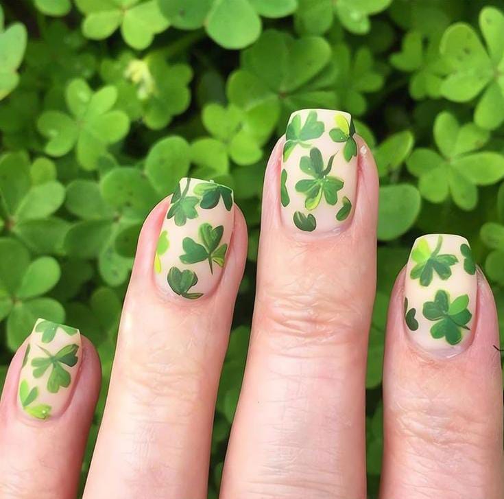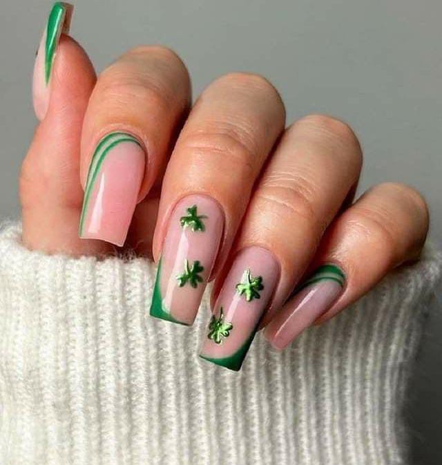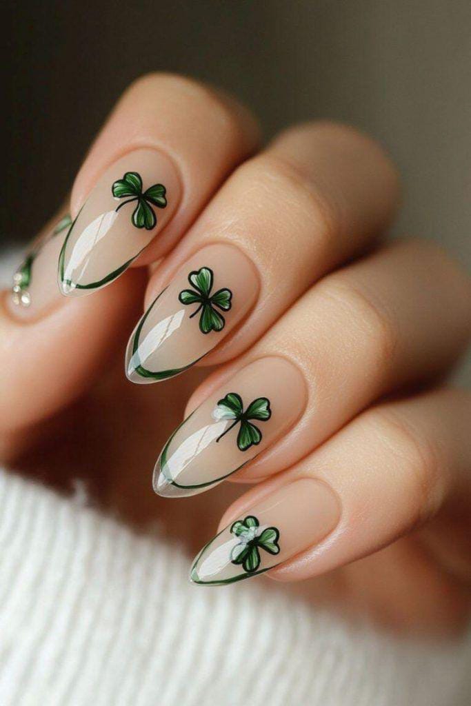 A nude base with scattered green clover prints gives this design an earthy, effortless look. It’s subtle and fresh, perfect for someone who wants St. Patrick’s day festive nails that still feel soft and natural.