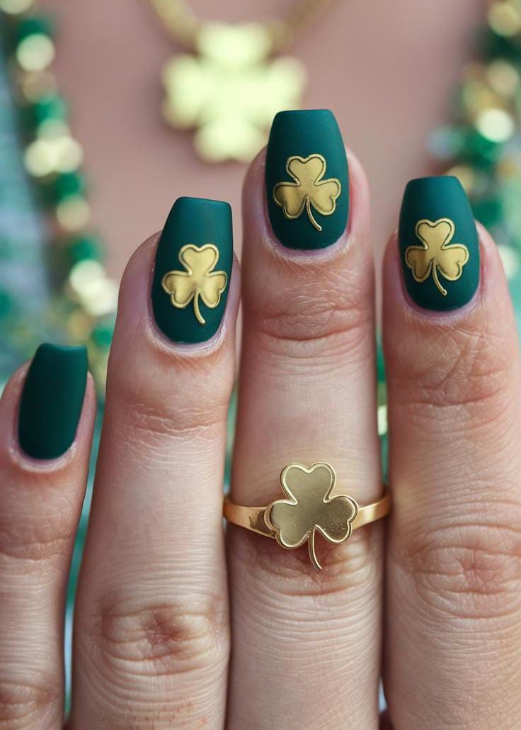 Deep green matte nails give this set a rich, velvety finish. Gold clover motifs elevate the look, adding a subtle touch of St. Patrick’s Day charm with a classy, almost jewelry-like feel.