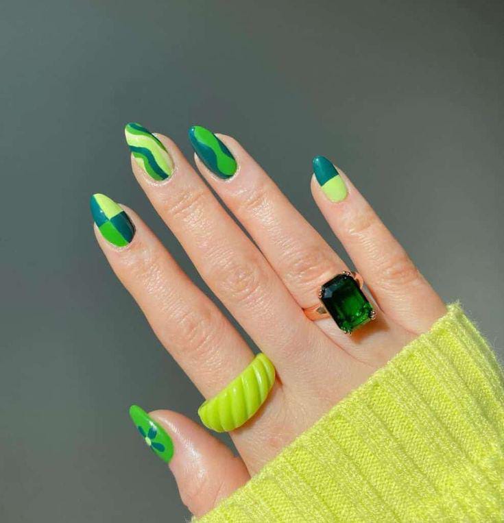 This design features flowing green tones layered in soft, abstract designs and waves accent nails. The look feels fresh, subtle and creative, perfect for celebrating St. Patrick’s Day in a low-key, stylish way.