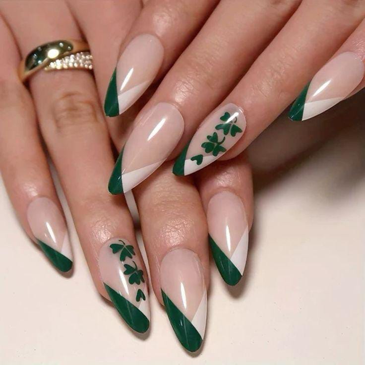Classic almond-shaped nude nails get a festive update with angled green and white French tips. Minimal clover accents keep the design light, graceful, and ideal for a subtle St. Patrick’s holiday-inspired manicure.