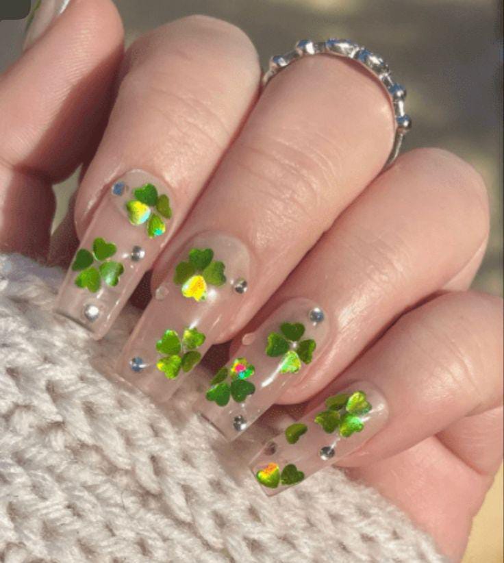 Clear, transparent nails are decorated with scattered green clover shapes and small gemstone accents. The look is fun and subtle St. Patrick’s Day while still keeping the overall style delicate and airy.