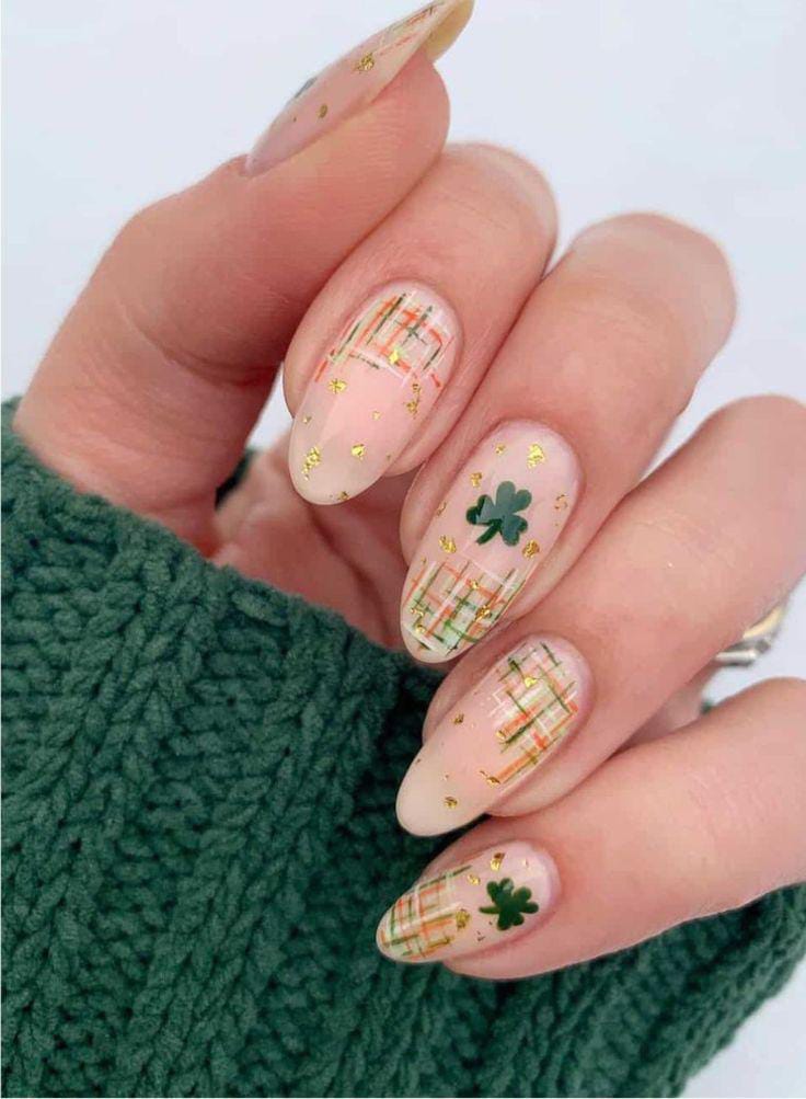 A muted nude base is paired with fine plaid lines and tiny shamrock details in soft green tones. Gold flecks add warmth, creating a cozy, seasonal St. Patrick’s Day looks polished and subtle.