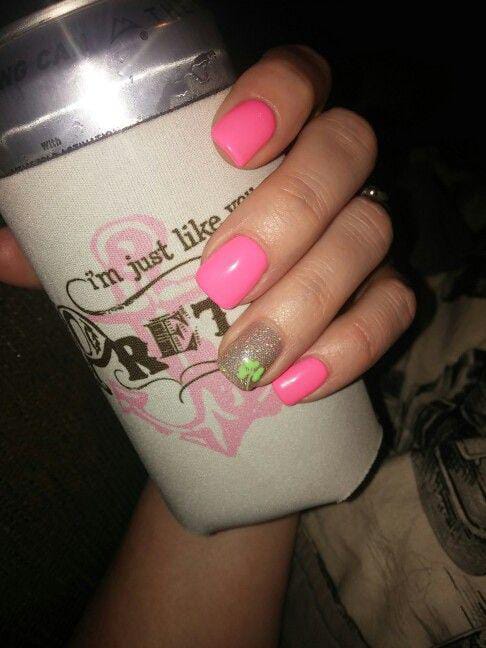 This design pairs bright pink nails with a single glitter accent nail featuring a tiny green shamrock. The contrast feels playful yet subtle, adding a hint of St. Patrick’s Day charm without overpowering the look.