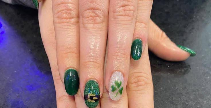 Deep green nails are paired with a sparkling accent nail that includes a small shamrock and buckle detail. The design feels elegant and festive without being over-the-top, giving a classy nod to St. Patrick’s Day.