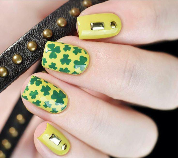 Bright yellow-green tones are combined with scattered dark green shamrocks and gold bold studs for a fun, cheerful St. Patrick’s day look. Despite the color pop, the pattern stays balanced and not overly busy.